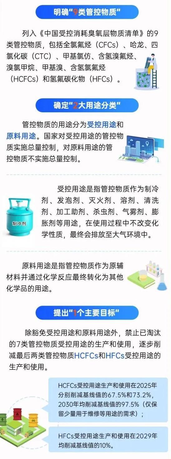 此次公告旨在履行《《关于消耗臭氧层物质的蒙特利尔议定书》(以下简称议定书)规定的目标。根据生态环境部等五部门于2025年4月9日联合印发《中国履行〈关于消耗臭氧层物质的蒙特利尔议定书〉国家方案(2025—2030年)》(下称《国家方案》)显示,我国正式进入含氢氯氟烃(HCFCs)淘汰和氢氟碳化物(HFCs)削减双线日起,将分阶段逐步禁止生产以氢氟碳化物(HFCs)类和氢氯氟碳化物(HCFCs)类为制冷剂的相关产品。