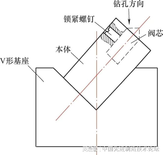 1)利用本体与V形基座的配合,实现角度的转换,使零件的斜面与基准平面平行,与钻孔方向垂直,使钻孔顺利进行。