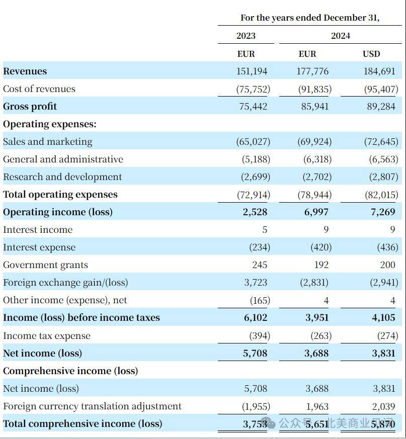 从经营业绩来看,爱购控股2023年及2024年的营收分别为1.512亿欧元和1.778亿欧元,毛利分别为7,540万欧元和8,590万欧元,毛利率分别高达49.9%和48.3%。
