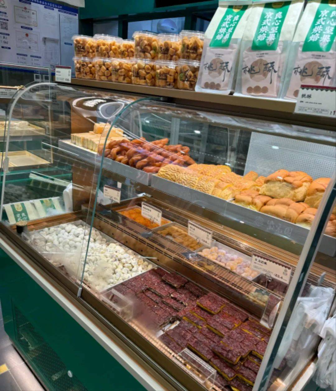 面包和炒货都是牛角包、吐司、肉松小贝、芒果干、瓜子等常见产品,点心则以是驴打滚、小糖火烧、牛舌饼、糖耳朵等,整体以京味点心为主,占比2/3。