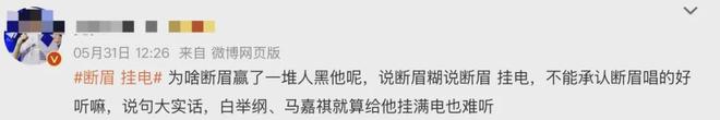 有趣的是,还有粉丝认为断眉挂电是网友在黑他,就是嫉妒断眉唱得好,就算挂电了,那还得是人家断眉有底子,要是给别的歌手挂电,该难听照样难听。
